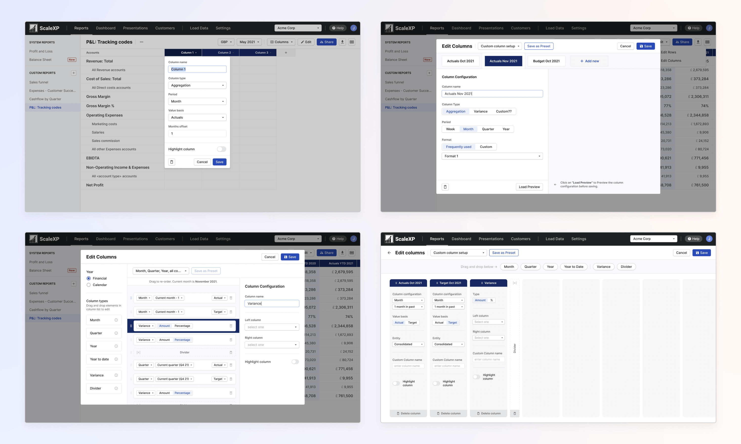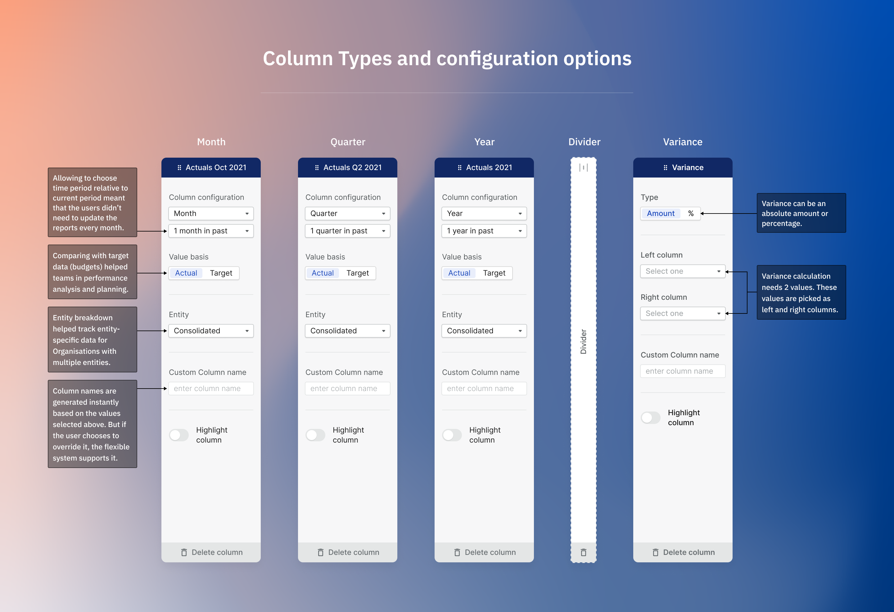 While creating or editing a report, the user can choose the column configuration from a list of presets (predefined by the system). But as businesses from multiple geographies and sectors started being part of the customer base, the requirement of more flexible columns arose; as it became difficult to maintain a single preset list to satisfy every unique use-case.