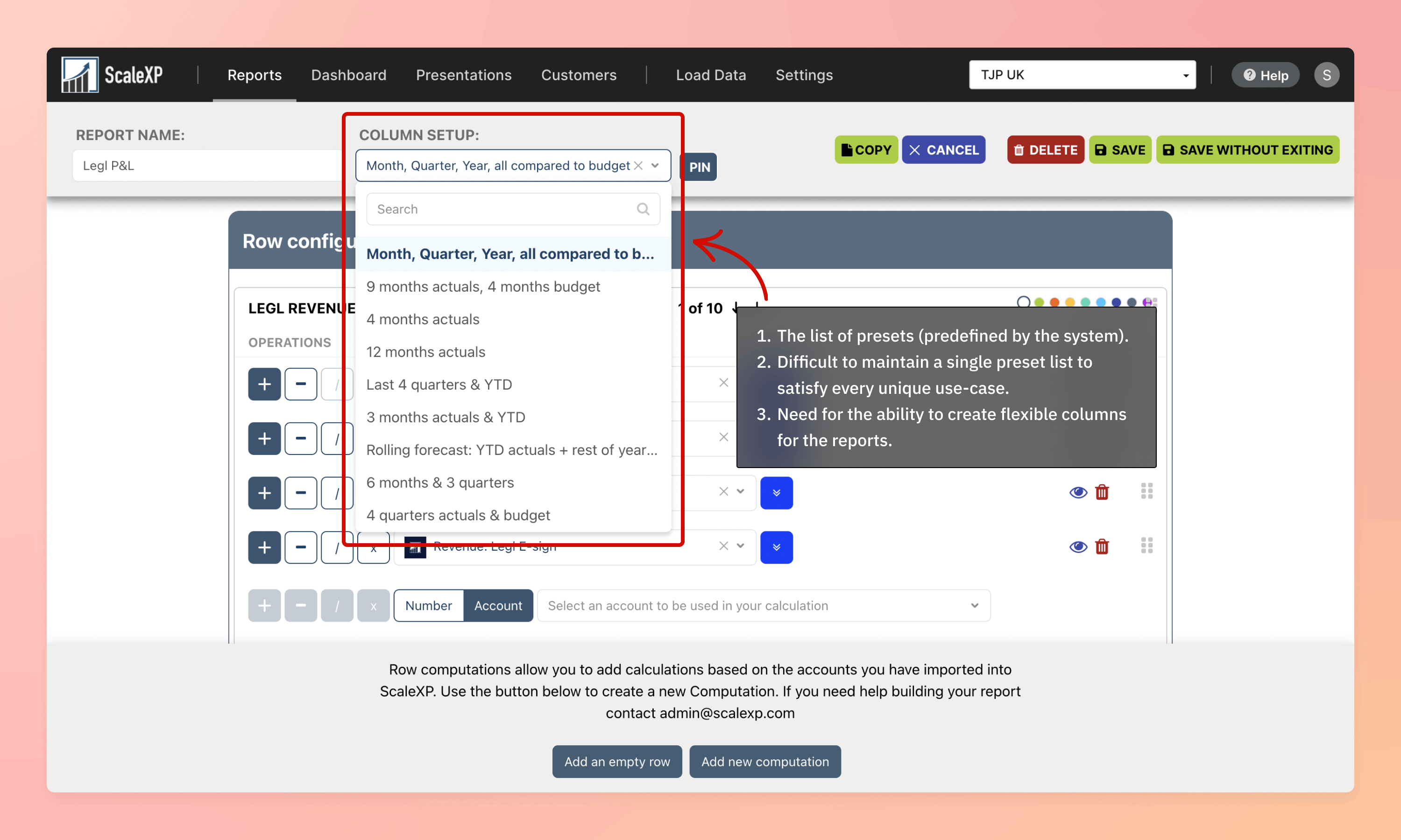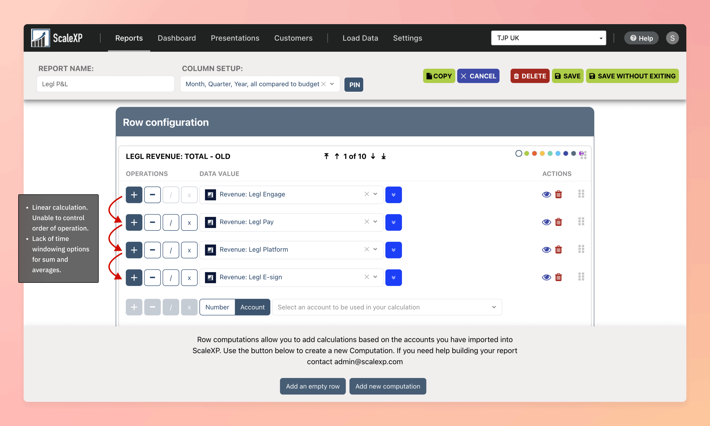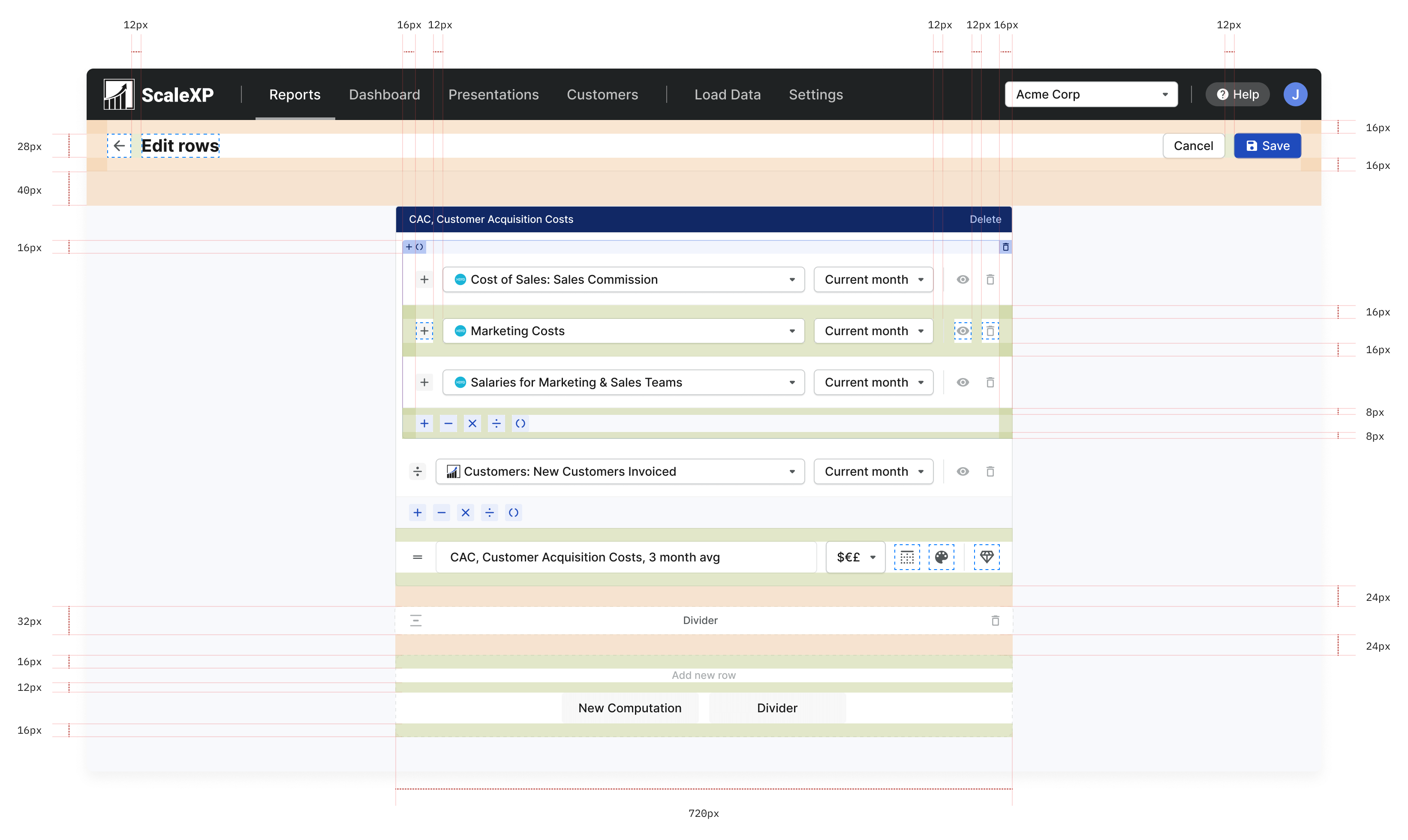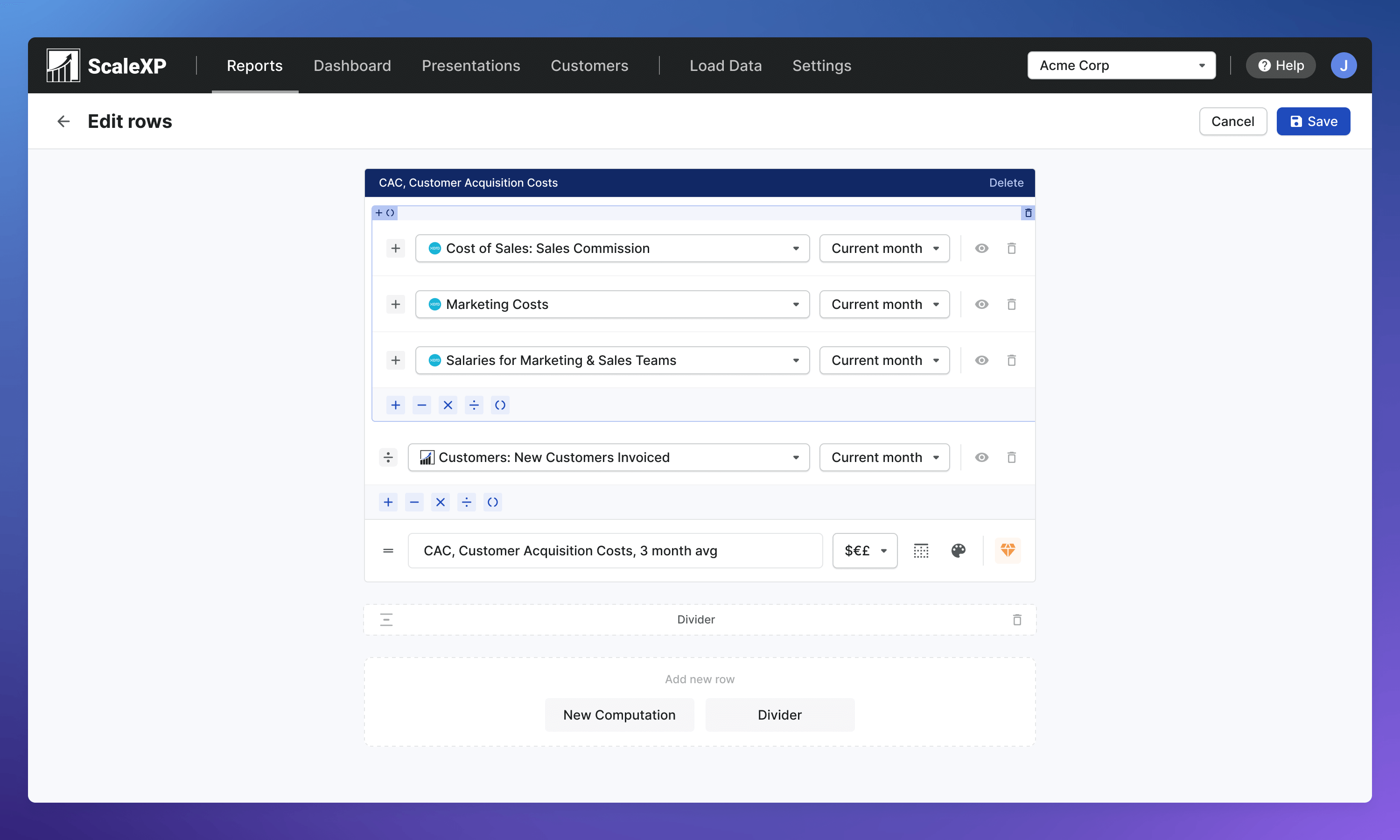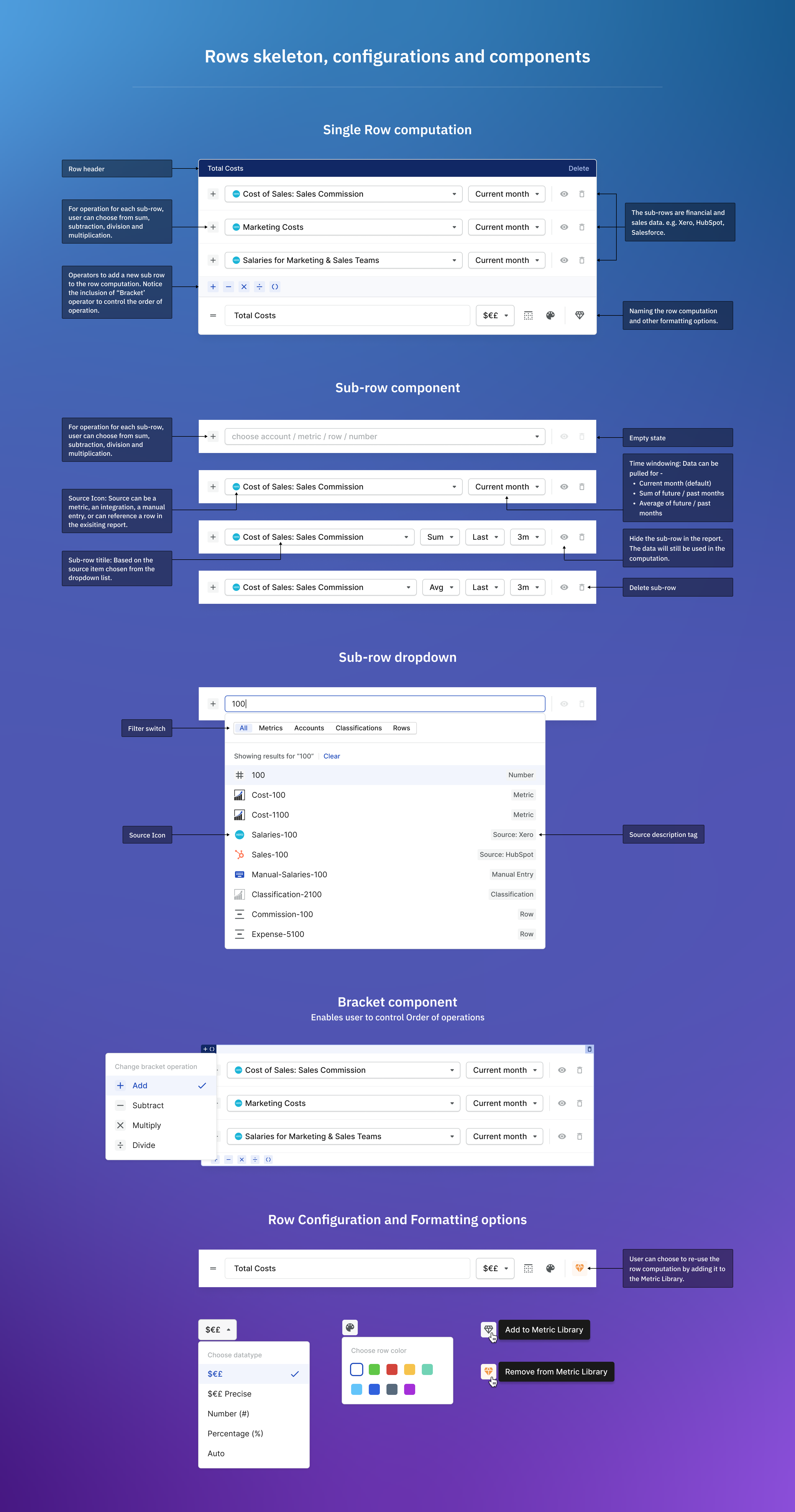 ScaleXP pulls in financial and sales data from Xero, HubSpot, Salesforce, etc. While configuring rows in a report, the user defines computation at each row-level using the above data. All accounts (sub-entities) that are part of this computation are displayed as sub-rows. The computation for row calculation is linear, which worked great for financial reports, but was restrictive for calculating other complex business metrics (e.g. Customer acquisition cost).