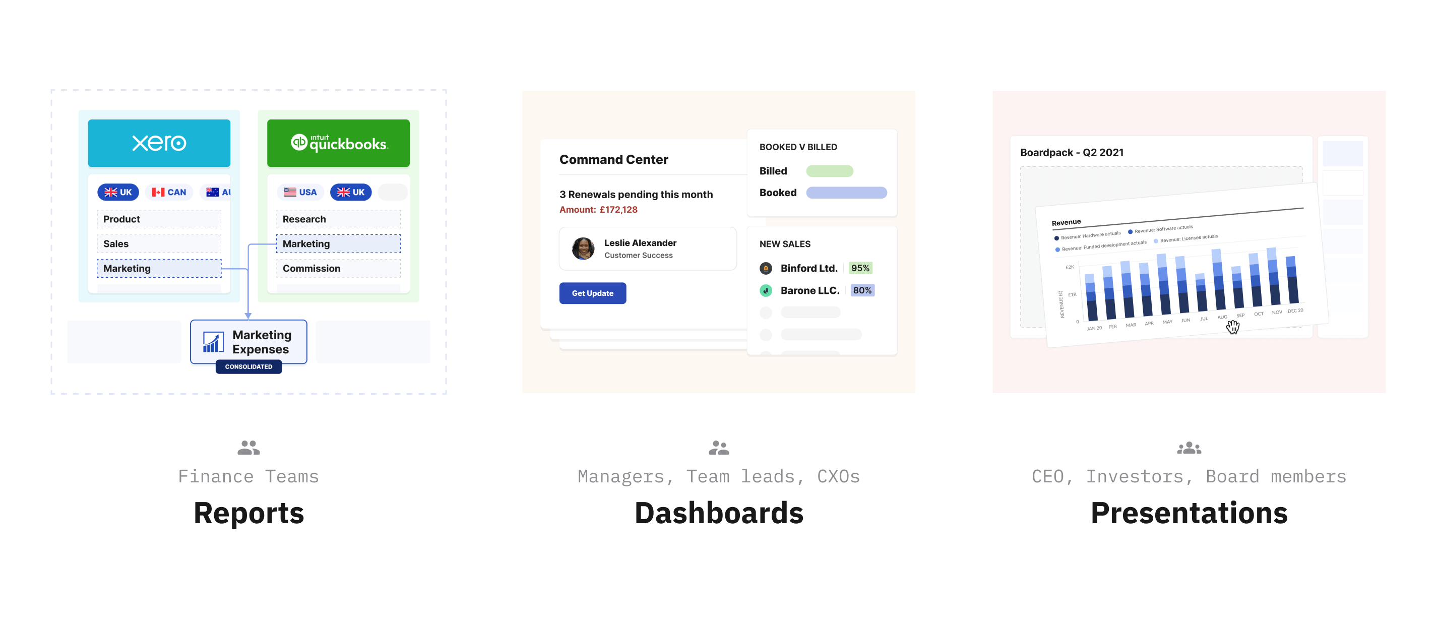 - Reports: Create time-series financial and business reports. Primary user persona: Finance teams.